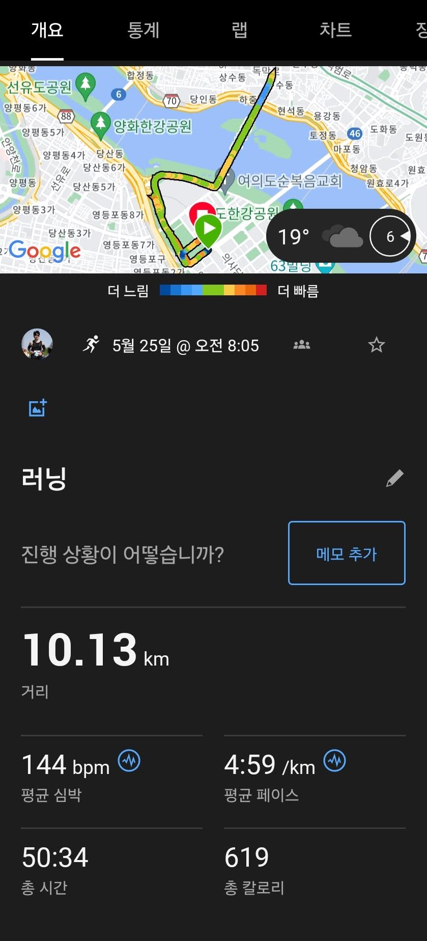 - 생각보다 업힐 구간이 많아 계획대로 레이스를 펼치기가 어려웠다. 평지에서 쌓아놓은 기록이 업힐에서 롤백되는 것이 반복되어 기록 단축이 위태위태했는데, 5km 반환지점의 서강대교 업힐 구간을 지나면서 기록 단축을 완전히 단념했다.ㅎ