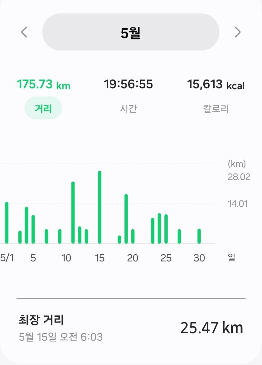 숙원과제였던 월 마일리지 150km를 넘겼다. 4월에 계획했던 것들이 잘 실천되어서 1회 러닝 거리와 빈도가 늘어난 것이 이유인 것 같다. 지난달과 비교하여 무려 40km 상승!